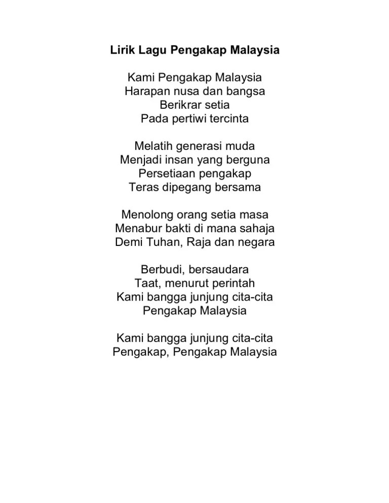 Download pdf 3 lirik lagu pengakap undang undang pengakap vnd5d3kywrlx. Lirik lagu rasmi persekutuan pengakap malaysia. Kami pengakap malaysia harapan nusa dan bangsa. Lagu rasmi pengakap malaysia ini diperdengar dan dinyanyikan didalam istiadat mengikut tatacara dan penghormatan.